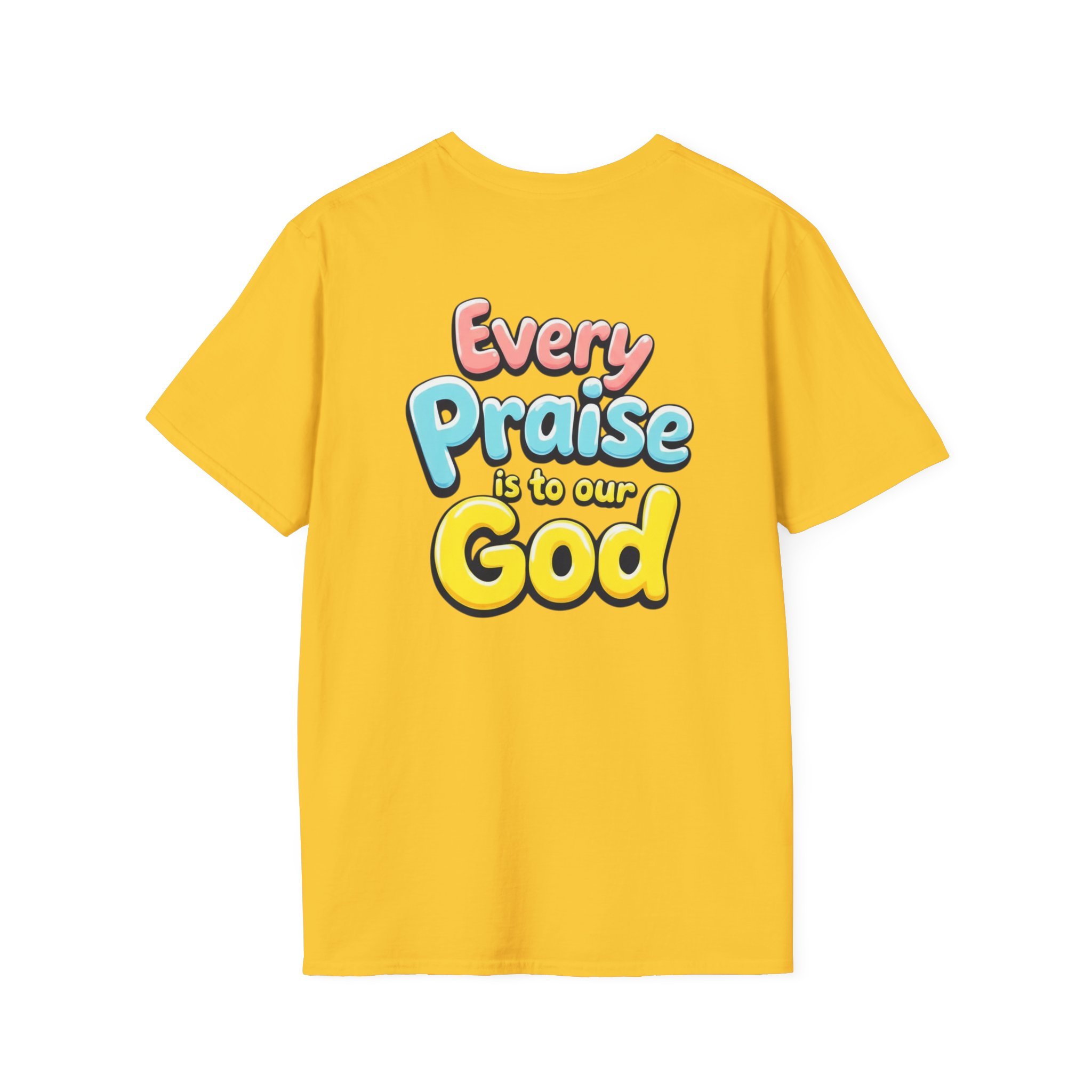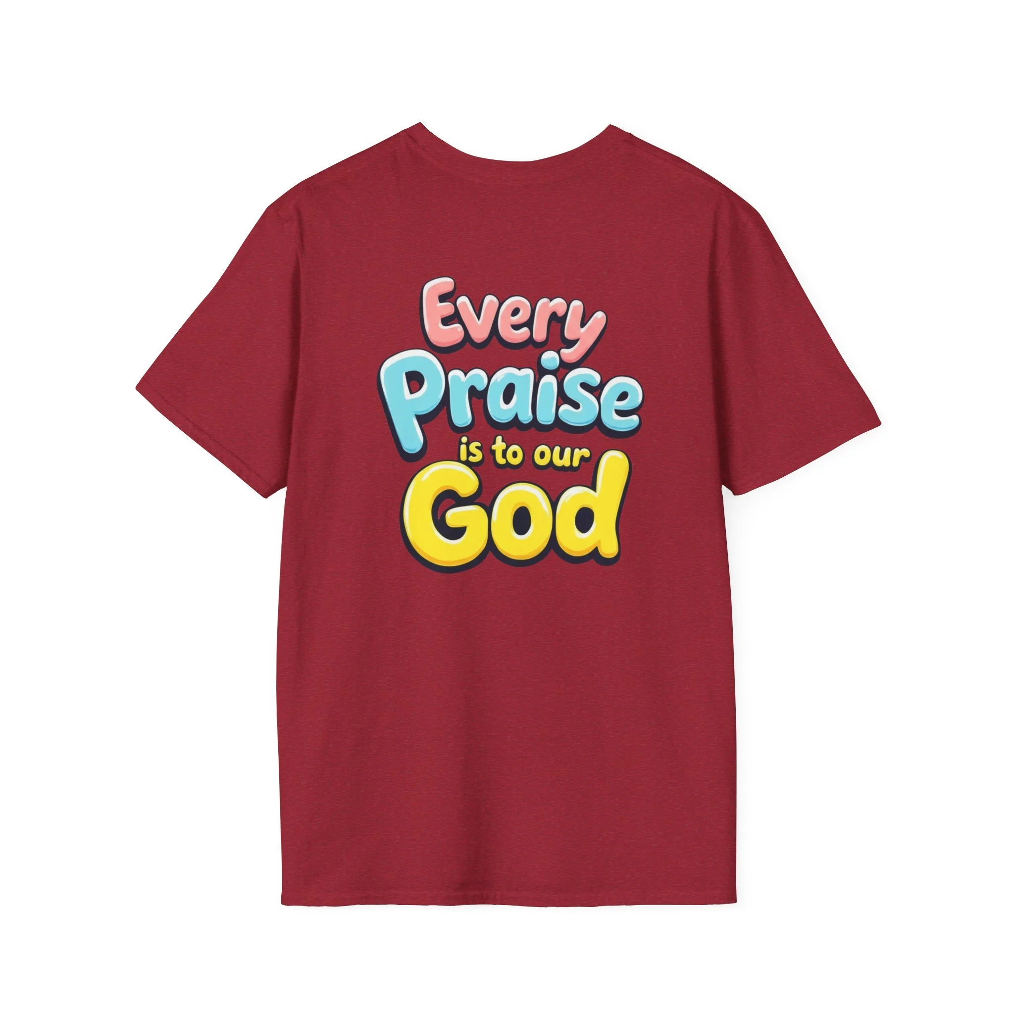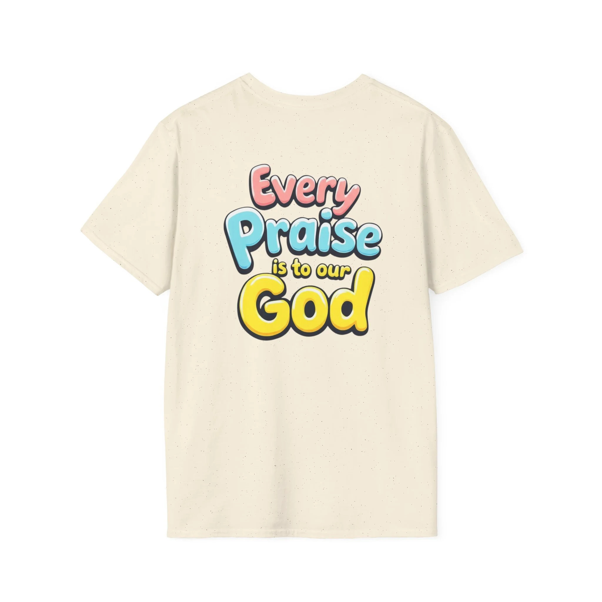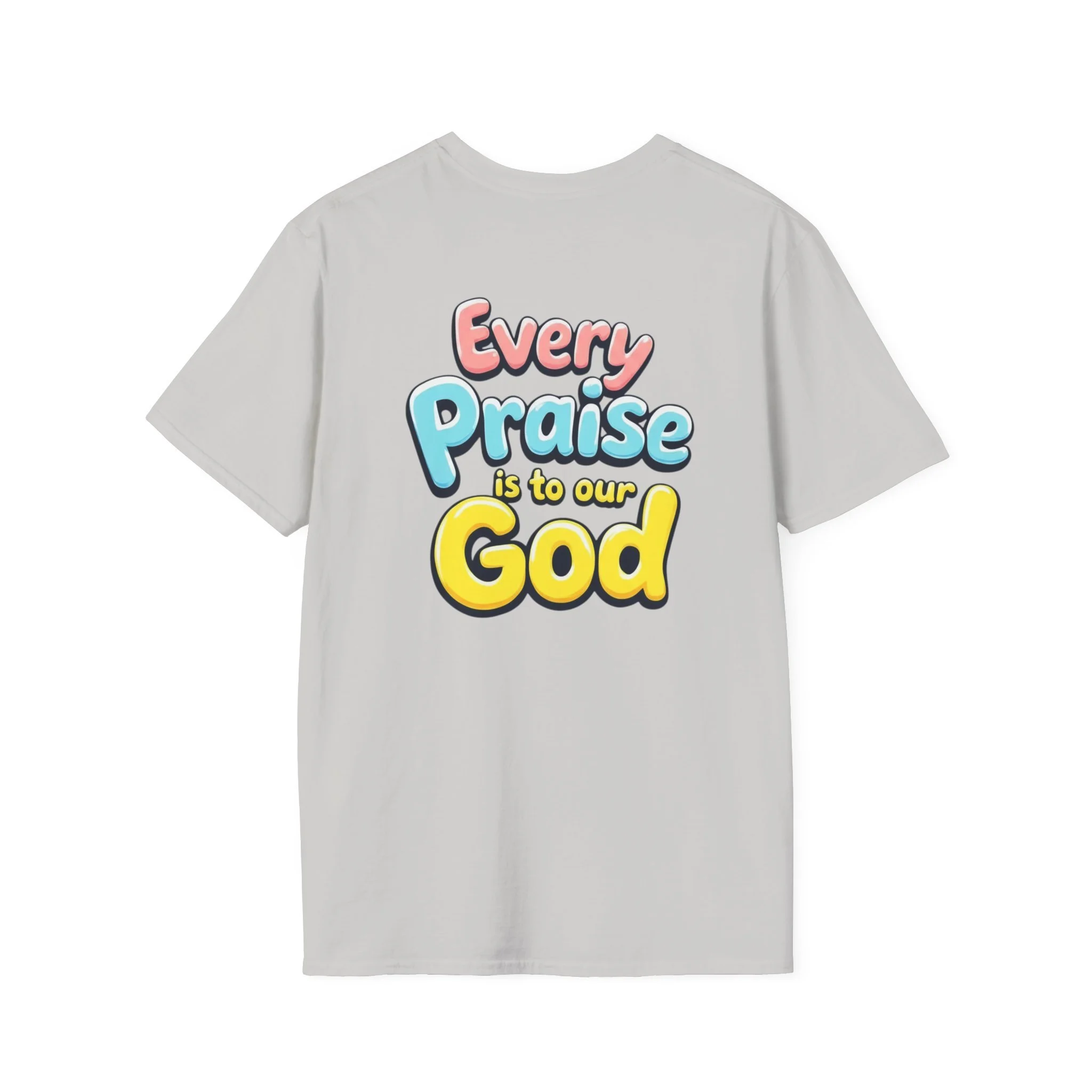 This lightweight crew-neck tee carries bold, devotional energy without being loud. The front features a simple circular emblem with a stylized cross and rising lines, while the back bursts with colorful, playful lettering that reads “Every Praise Is To Our God.” It sits comfortably on the shoulders and keeps shape thanks to ribbed collar and shoulder tape. Wear it to worship nights, youth group outings, community service days, or casual weekends when you want your faith to be bright and approachable. The fabric breathes and moves with you — it feels like a familiar voice in a crowd, warm and confident.