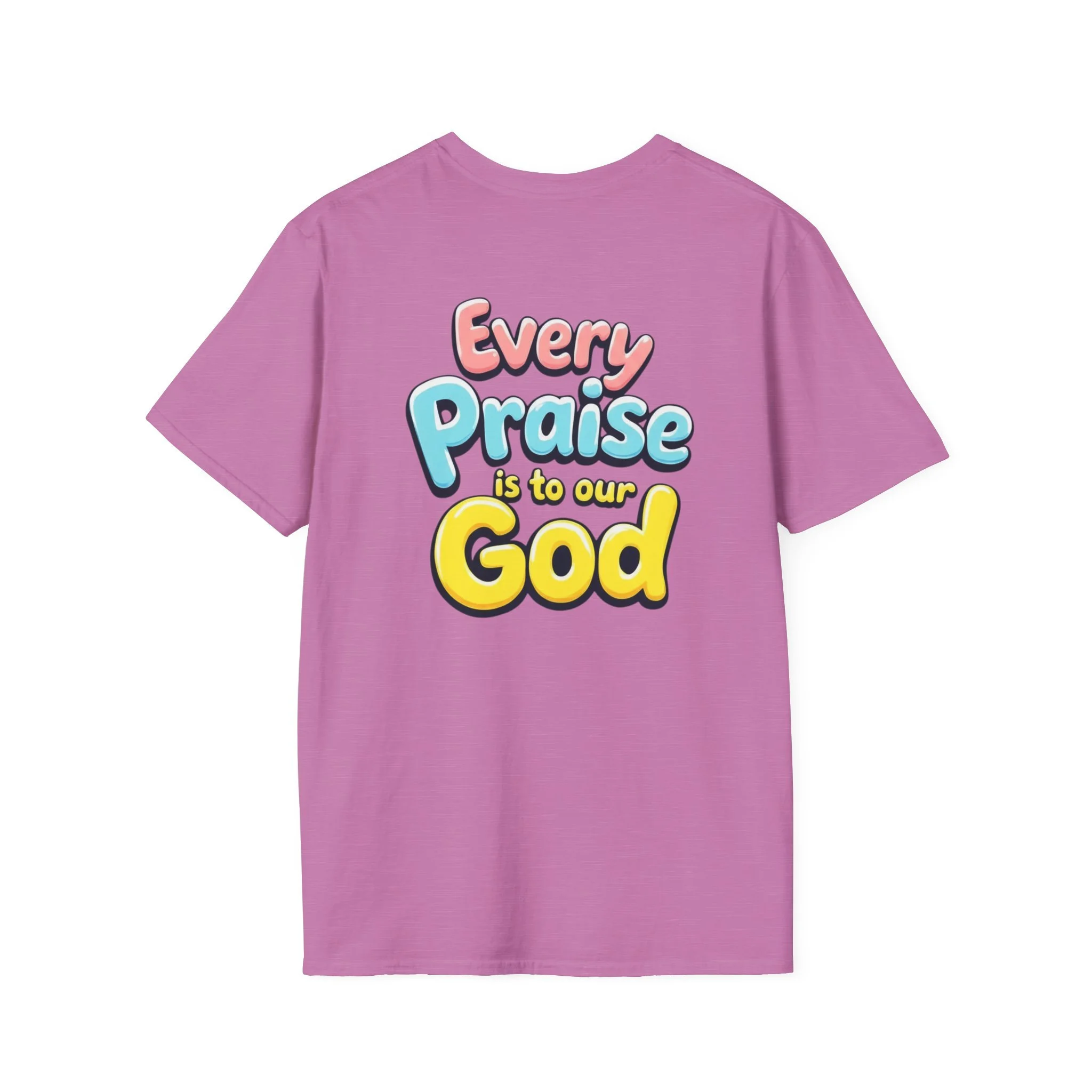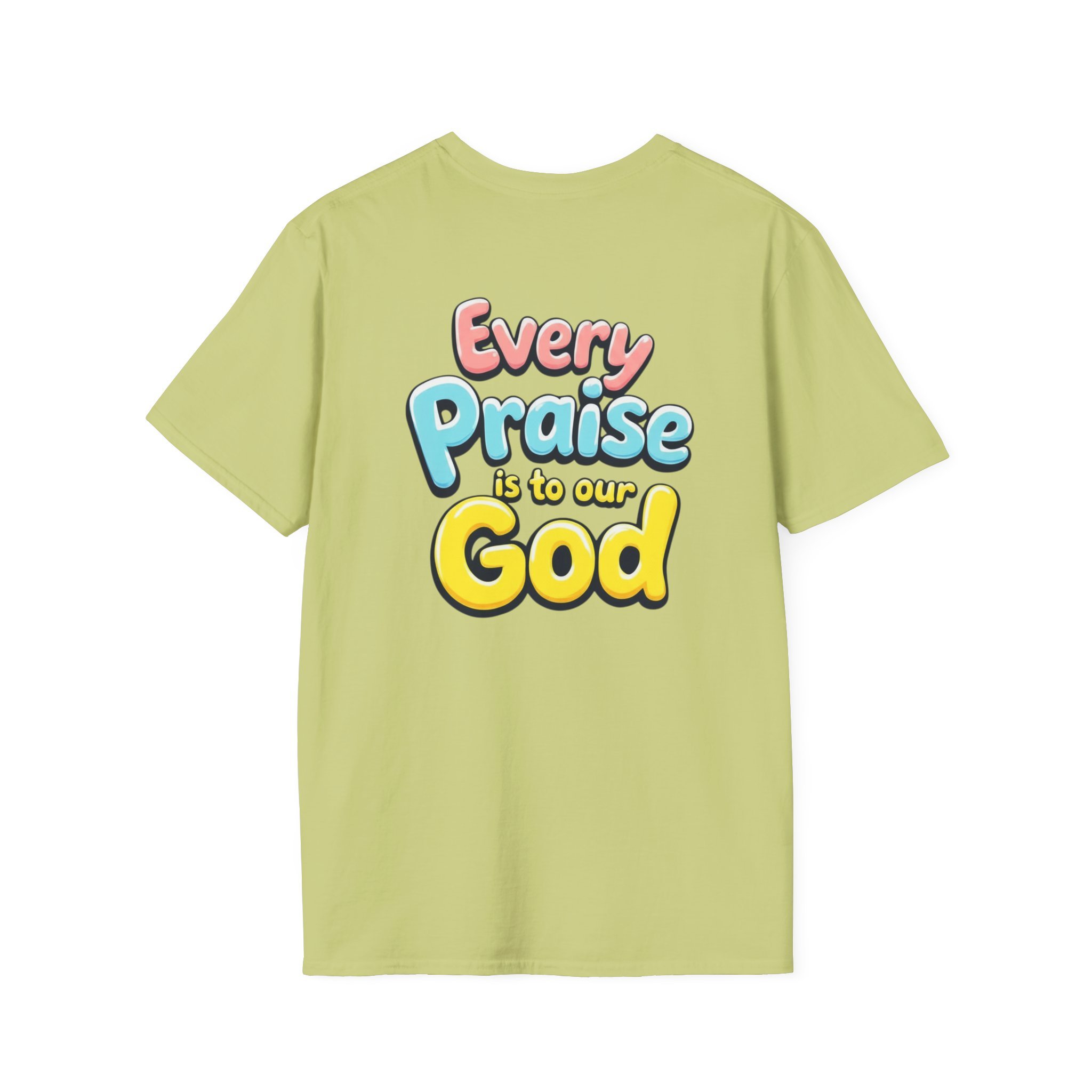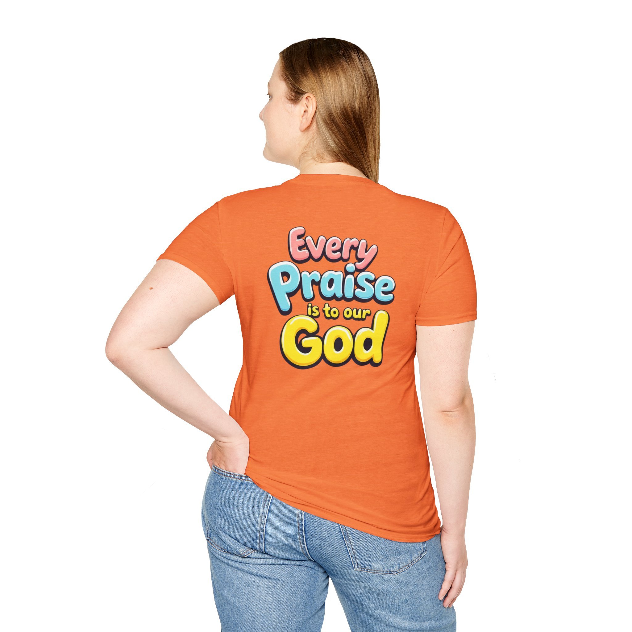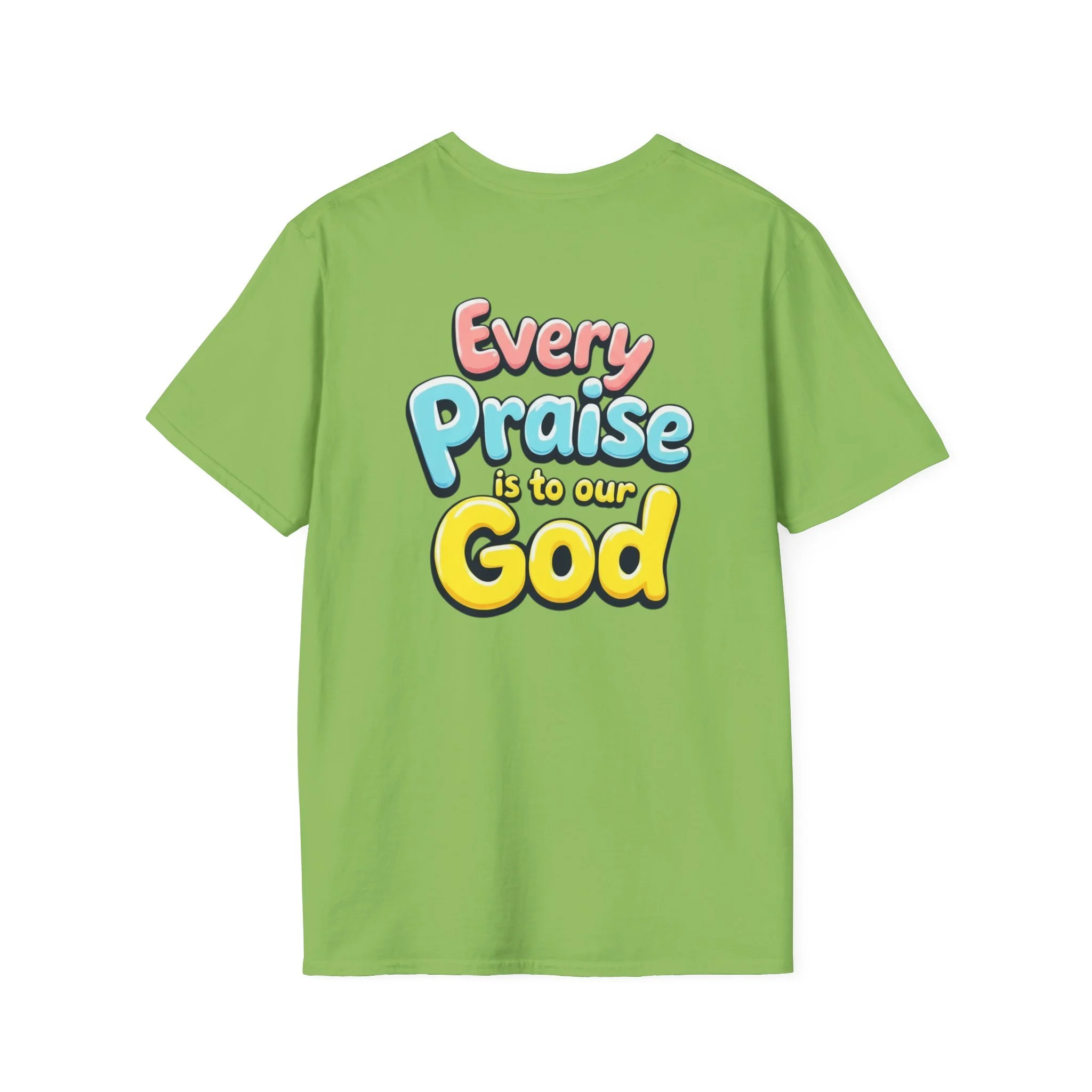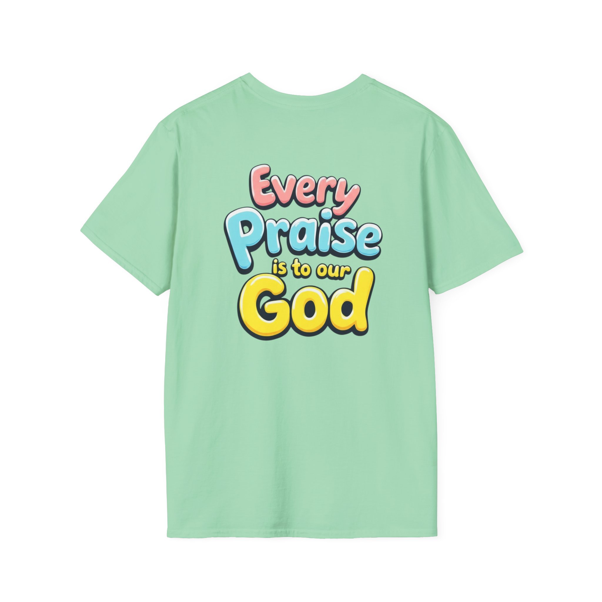 This lightweight crew-neck tee carries bold, devotional energy without being loud. The front features a simple circular emblem with a stylized cross and rising lines, while the back bursts with colorful, playful lettering that reads “Every Praise Is To Our God.” It sits comfortably on the shoulders and keeps shape thanks to ribbed collar and shoulder tape. Wear it to worship nights, youth group outings, community service days, or casual weekends when you want your faith to be bright and approachable. The fabric breathes and moves with you — it feels like a familiar voice in a crowd, warm and confident.